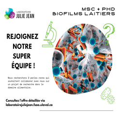 Dirigé par Julie Jean, professeure titulaire au département de Sciences des aliments de la Faculté des Sciences de l'Agriculture et d'Alimentation de l'Université Laval, le Laboratoire Julie Jean est composé de 8 étudiants (6 PhD, 1 MSc, 1 BSc), 1 stagiaire postdoctorale et 2 professionnels de recherche.