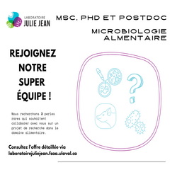 L'équipe du Laboratoire Julie Jean travaille sur plusieurs projets liés à la microbiologie alimentaire, s'attarde particulièrement à la recherche liée à :